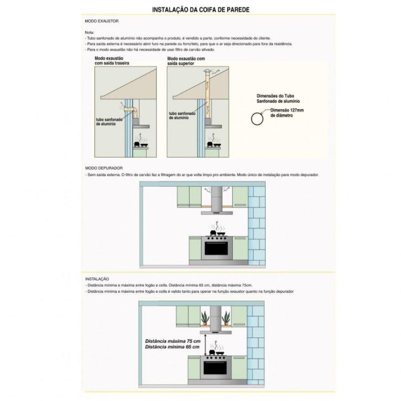 Sua coifa ja vai pronta para utilizar como depurador pois ja possui internamente filtro de carvao ativado. Caso deseje utilizar como exaustor com saida de ar externa, onde sera necessario fazer uma abertura na parede, apenas precisara comprar e instalar o tubo sanfonado de aluminio flexivel que temos disponivel para venda.