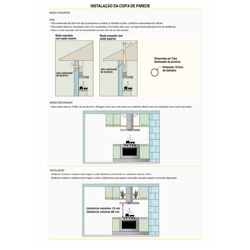 Duto dividido em superior e inferior com regulagem de altura. mínimo 68 cm e máximo 100 cm já considerando a altura da base da coifa
