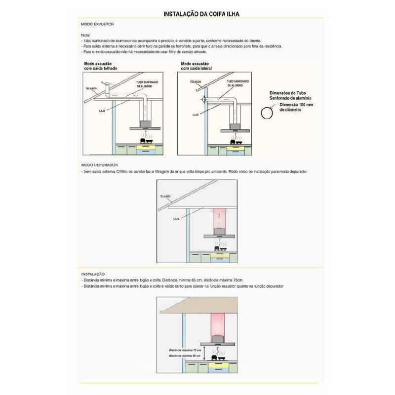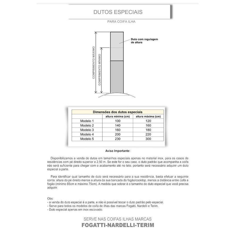 Para cozinhas com pe direito superior a 2,55 m. Temos disponivel para venda a parte, alguns tamanhos de dutos especiais. Nas imagens do anuncio disponibilizamos a informacao das medidas dos dutos especiais.