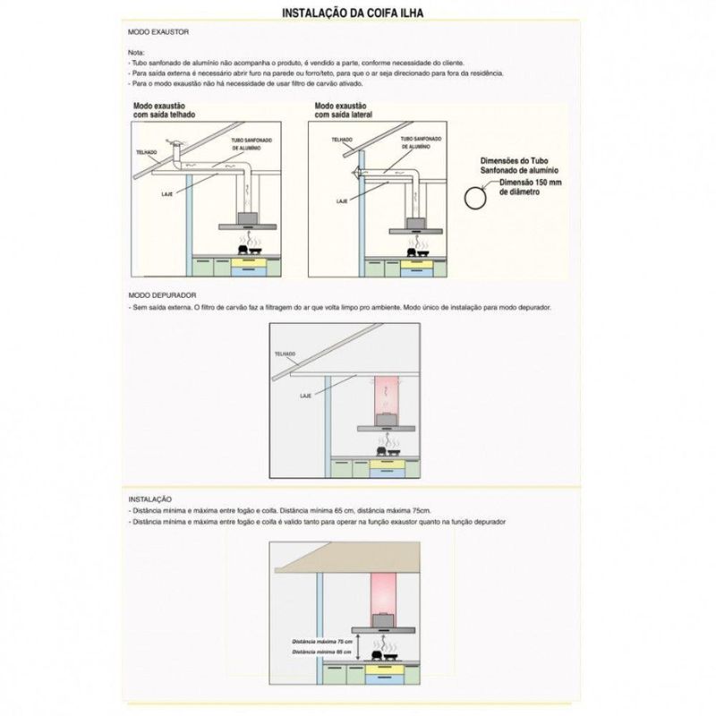 Atenção O Tubo sanfonado para exaustão, não acompanha o produto, Vendemos o tubo separadamente. O diâmetro de saída para o mesmo é de 150 mm de circunferência