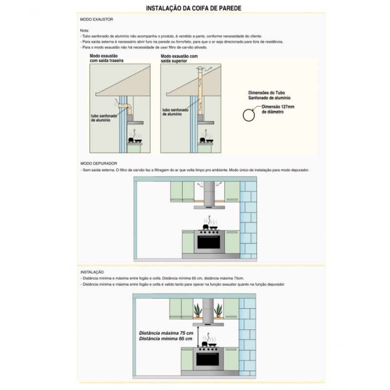 Observação, este modelo não aceita instalação no teto. Caso precise de coifa para instalar no teto, basta pesquisar por Coifa de ilha, e colocar a marca desejada
