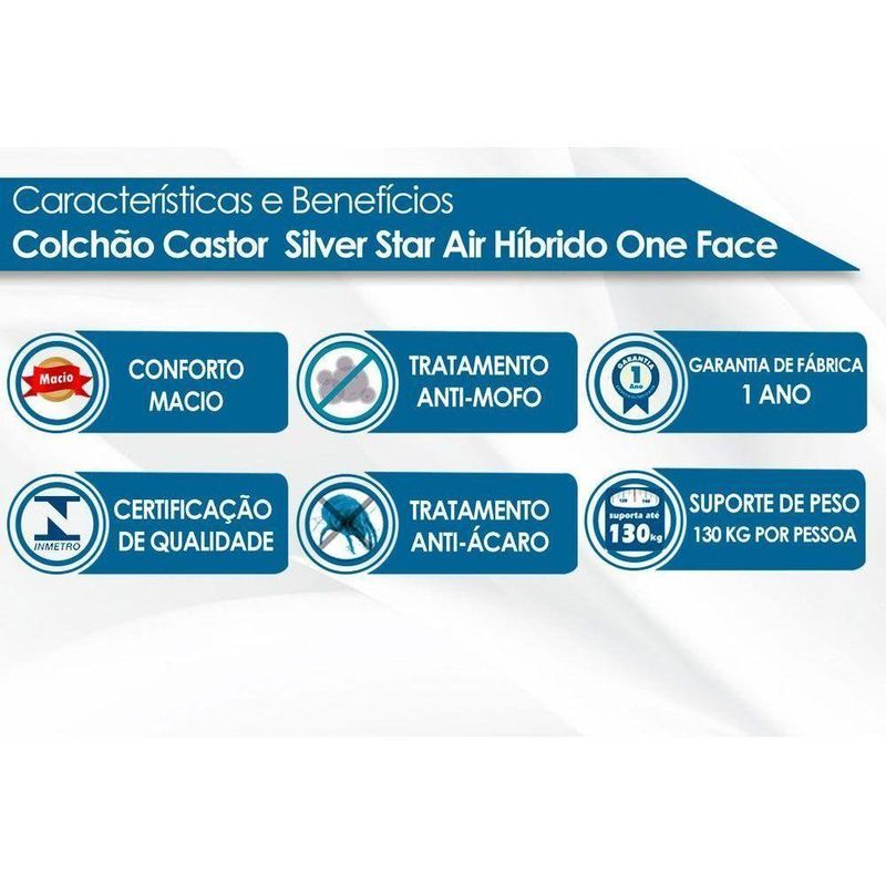 Todas as informações divulgadas são de responsabilidade exclusiva do fabricante/fornecedor. Forração Revestimento do Colchão: Bordado de Alta Qualidade | Nível de Firmeza do Colchão: Macio | Nossa Avaliação do Colchão: Qualidade Excelente | Peso Máximo Suportado do Colchão: 130 kg | Tempo de Garantia do Colchão: 12 meses | Vantagens Extras de Colchão: c/ Sistema Polyframe | Certificação de Qualidade do Colchão: Qualidade Aprovada | Tecido de Revestimento da Faixa Lateral do Colchão: Suede | Bordado do Revestimento do Colchão: Contínuo | Tipo de Pillow: Pillow Top Europeu | Modo de Utilização do Colchão: One Side | Camadas Interna do Estofamento de Espuma do Colchão: D20 | Tipo de Mola do Colchão: Pocket Híbrido | É eco-friendly: Sim | É antiácaros: Sim | Com moldura perimetral: Não | Com pegas laterais: Não | Número de registro/certificação INMETRO: N/A | Tipo de Produto: N/A | É kit?: Não | Condição do item: | Fonte do produto: N/A | Código universal de produto (GTIN): 7896506722095 | Produto precisa de Montagem?: Sim, a montagem é simples mas sugerimos a contratação do nosso serviço de montagem (para os CEPs em que o serviço está disponível) ou de algum experiente de sua preferência | Descrição do Tamanho: 32.00x:138.00x188.00 cm | Estado de Origem: RJ | País de origem: Nacional | Peso Produto Com Embalagem (Kg): 62.27 | Material para Filtro: N/I | Cor Mobly: N/I | Condição do Item: | Link Site: https://www.costaricacolchoes.com.br/produtos/22992S231/ | Numeral: 0 | Não se Aplica: N/A | Não Possui: Não | Link Youtube: https://www.youtube.com/watch?v=1GI0qSWMcC4 | ID Youtube: 1GI0qSWMcC4 | Linha/Modelo: Castor | Cor Cnova: Blush | Cor Meli: Ciano | Contatos Sac Fábrica: sacmg@castor.ind.br/sac3@castor.ind.br | Categoria - Sub: Colchão de Molas Ensacadas | Categoria - Pai: Colchão | Comnto Embalagem: 188.00 | Largura Embalagem: 138.00 | Altura Embalagem: 32.00 | Kit: 0 | Peso: 62.27 Kg | Peso Real Kg: 62.27 | Peso Cubado: 207.55 | Volumes: 1 | M3: 0.83 | Comnto/Profundidade: 188 cm | Largura: 138 cm | Altura: 32 cm | Tamanho Montado: Larg:138.00 x Comp/Prof:188.00 x Alt: 32.00 | Comnto/Profundidade Montado: 188.00 | Largura Montado: 138.00 | Altura Montado: 32.00 | MPN: 10872 | Tamanho Cama Colchão: Casal | Marca: Castor | Fabricante: Castor | Linha: Castor