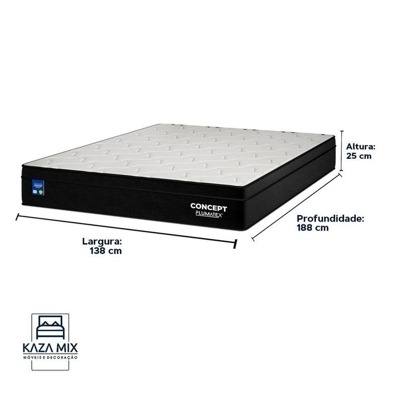 A lateral em Kupon e o pillow INN complementam o design, conferindo um visual moderno e elegante. Com 25 cm de altura, suporte para até 110 kg e detalhes de construção que incluem EPS para estabilidade e TNT 100g para maior aderência, o Concept é a escolha ideal para quem valoriza um descanso confortável e refinado.