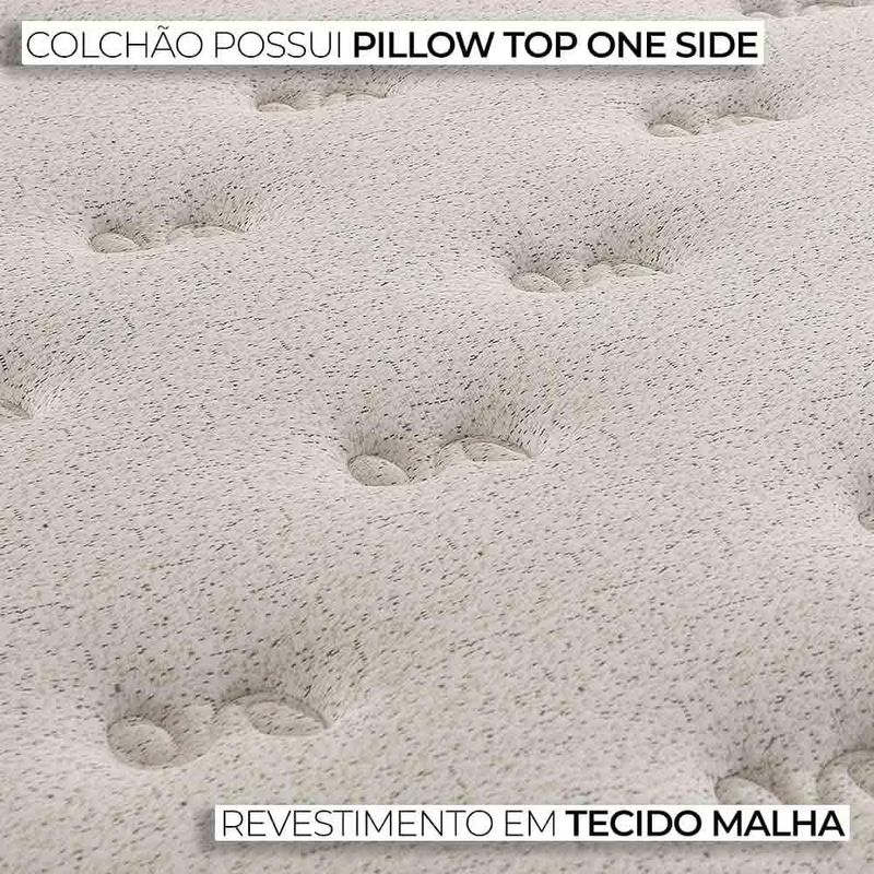 Nível de Conforto | Firme Molejo | Molas Maxspring, 206 Molas p/m² Isolante | Feltro resinado Estrutura | Monobloco de molas entrelaçadas, em aço com arame ATC com 2,00 mm de diâmetro Bordado | Lâminas de espuma de alta performance Pillow Top One Side | Camada extra de conforto Revestimento tampo | Malha 100% Poliéster Faixa tecido | 51% Poliéster 49% Algodão Tampo | Tecido Antiderrapante Lateral | Ultrassom