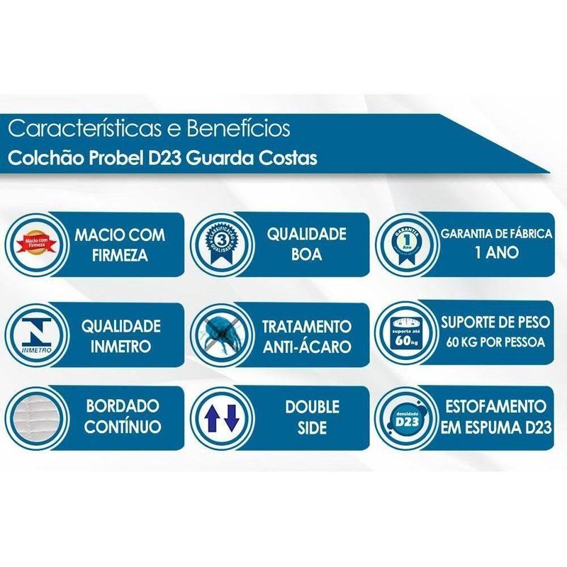 Todas as informações divulgadas são de responsabilidade exclusiva do fabricante/fornecedor. Forração Revestimento do Colchão: Poliéster Nível de Firmeza do Colchão: Macio c/ Firmeza Nossa Avaliação do Colchão: Qualidade Boa Peso Máximo Suportado do Colchão: 60 kg Tempo de Garantia do Colchão: 12 meses Certificação de Qualidade do Colchão: Qualidade Aprovada Bordado do Revestimento do Colchão: Matelassê Tecido com Tratamento do Colchão: AntiÁcaro e AntiFungo Modo de Utilização do Colchão: Double Side Camadas Interna do Estofamento de Espuma do Colchão: Alta Qualidade Densidade da Espuma do Colchão: D23 É eco-friendly: Sim É antiácaros: Sim Com moldura perimetral: Não Com pegas laterais: Não Número de registro/certificação INMETRO: N/A Tipo de Produto: N/A É kit?: Não Condição do item: Novo Fonte do produto: N/A Código universal de produto (GTIN): 7899108967055 Produto precisa de Montagem?: Sim, a montagem é simples mas sugerimos a contratação do nosso serviço de montagem (para os CEPs em que o serviço está disponível) ou de algum profissional experiente de sua preferência Descrição do Tamanho: 17.00x:128.00x188.00 cm Estado de Origem: RJ País de origem: Nacional Peso Produto Com Embalagem (Kg): 30.68 Material para Filtro: N/I Cor Mobly: N/I Condição do Item: Novo Numeral: 0 Não se Aplica: N/A Não Possui: Não Linha/Modelo: Probel Cor Cnova: Blush Cor Meli: Ciano Categoria - Sub: Colchão de Espuma D23 Categoria - Pai: Colchão Comprimento Embalagem: 188.00 Largura Embalagem: 128.00 Altura Embalagem: 17.00 Peso: 30.68 Kg Kit: 0 Peso Real Kg: 30.68 Peso Cubado: 102.27 Volumes: 1 M3: 0.41 Comprimento/Profundidade: 188 cm Largura: 128 cm Altura: 17 cm Tamanho Montado: Larg:128.00 x Comp/Prof:188.00 x Alt: 17.00 Comprimento/Profundidade Montado: 188.00 Largura Montado: 128.00 Altura Montado: 17.00 MPN: PA51537 Tamanho Cama Colchão: Casal Marca: Probel Fabricante: Probel Linha: Probel