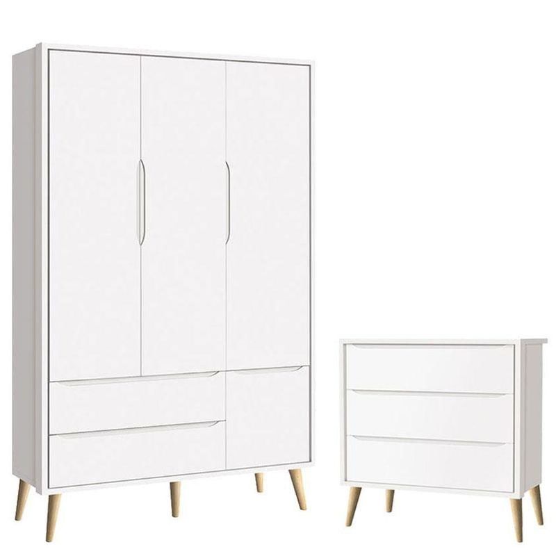 Cômoda Gaveteiro Infantil E Guarda Roupa 3 Portas Theo Branco Acetinado Pés Madeira Natural - Reller