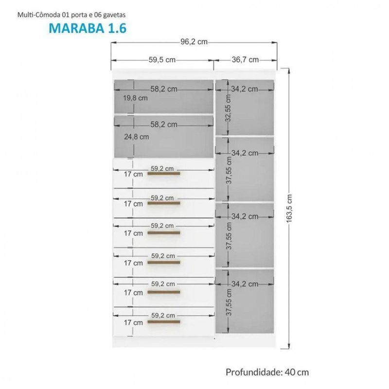 A Multi Cômoda Marabá da Santos Andirá é um móvel incrível que pode ser utilizado em vários ambientes da casa: na cozinha, na garagem, no quarto, na lavandeira. Suas inúmeras utilidades permitem guardar muitos objetos. Possui 06 amplas gavetas com corrediças metálicas, 02 prateleiras e uma porta com prateleiras. é muito espaço para guardar tudo que precisa.