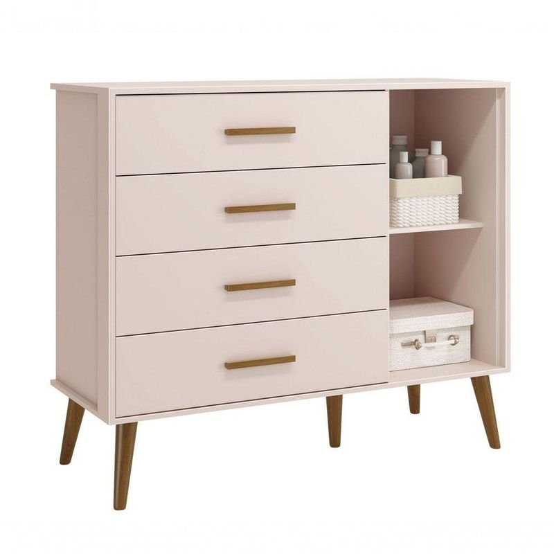 Evidênciando um ar retrô com o modelo de seus pés em madeira maciça, a Cômoda Sapateira Retrô Isis - MóveisAqui possui um desing clean que combina com vários estilos de decoração. É perfeita para a organização das roupinhas e acessórios do seu baby, proporciona um mega espaço para armazenamento e com divisória interna, para que a organização do dia-a-dia possa ser mais fácil. Possui puxadores em MDF envelopado.Dimensões do Produto Montado:Altura: 91 cmLargura: 133 cmProfundidade: 46 cmObservações:- 04 gavetas;- 01 porta;- 01 prateleira interna;- Corrediças Telescópicas;- Puxadores em MDF;- Sistema anti Tombamento;- Pés na cor Madeira;- Pintura ultravioleta com acabamento fosco.