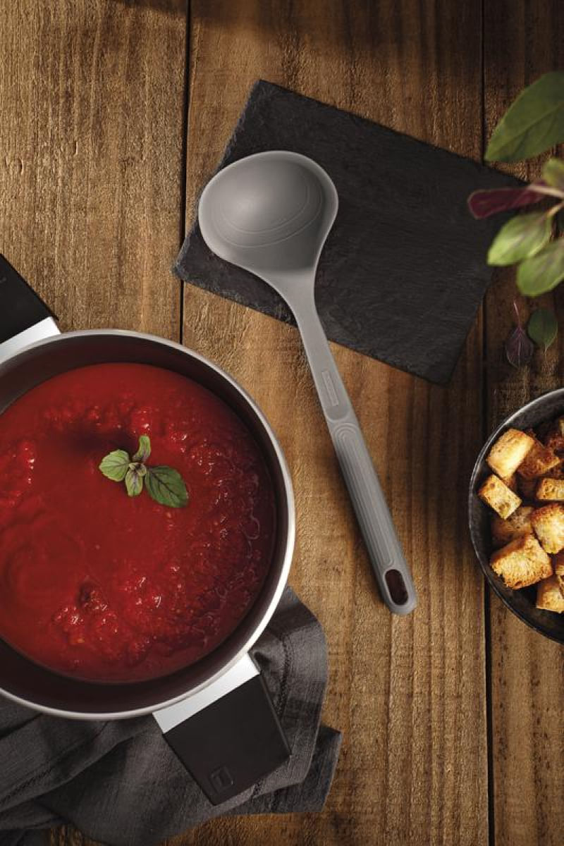 Servir sopas, caldos e molhos fica mais fácil com a concha Tramontina Softta em silicone cinza. Resistente a até 210 °C, ela é ideal para uso em panelas com revestimento antiaderente, sem causar riscos. O silicone de alta qualidade garante firmeza e segurança no manuseio, enquanto o cabo anatômico oferece mais conforto durante o uso. Após o preparo, é só levar à lava-louça para uma limpeza descomplicada. Com visual moderno e acabamento neutro, a concha Softta é aquele item que une praticidade e bom gosto na medida certa.