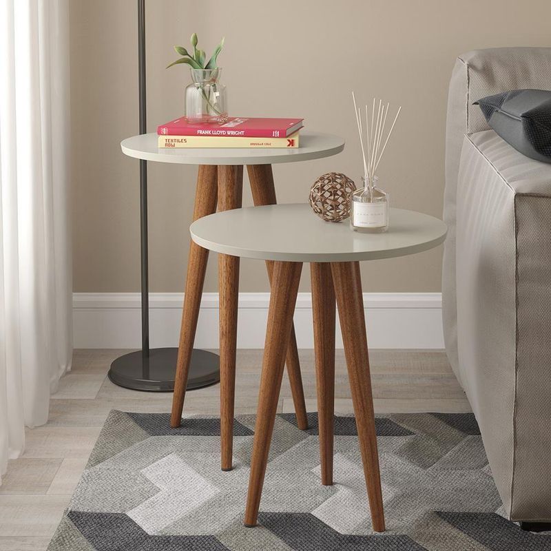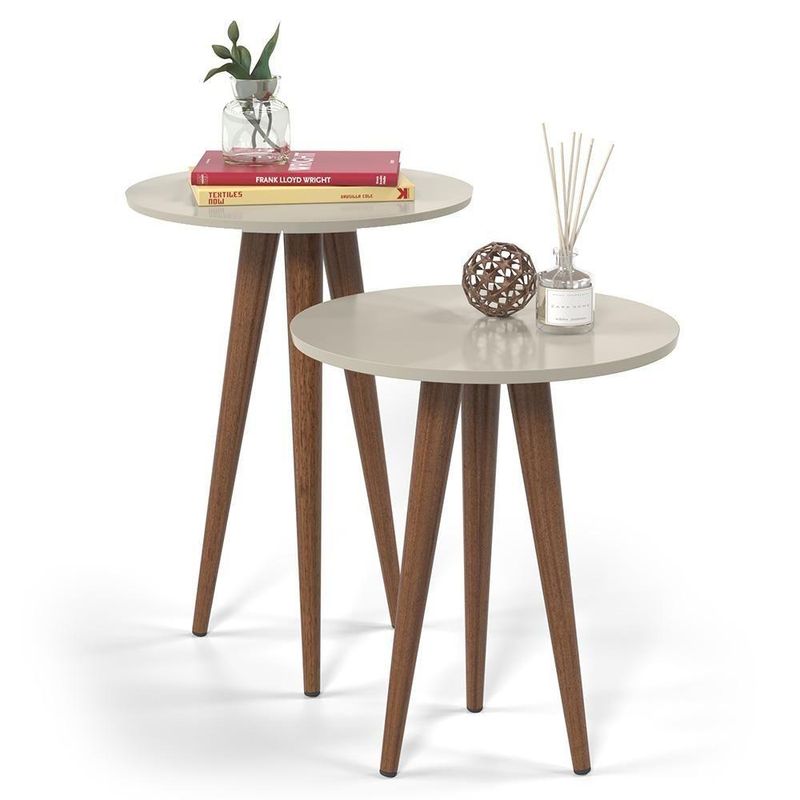 Tá buscando por mesinhas para colocar suas decorações e lembranças? Vamos te apresentar agora as mesas Slim, 2 peças fundamentais que vão agregar a qualidade e o visual retrô que sua sala de estar merece. Produzidas com materiais de alta qualidade, elas com certeza vão dar aquele charme e ar clean que você está procurando para o seu ambiente. Seu tampo redondo é em madeira MDF e seus pés palito em madeira maciça com sapatas protetoras. Com o conjunto de mesa lateral e apoio Slim sua casa estará sempre linda. NA