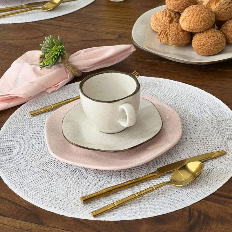 Conjunto 4 Pratos de Sobremesa 21,5cm Ryo Pink Sand Porcelana Oxford Valorizar o imperfeito, o processo de criação até o seu acabamento. Este é o conceito wabi-sabi, uma visão de mundo japonesa praticada desde o século XV e que tem como base os ideais de uma estética que exalta o irregular, o impermanente e o incompleto. Seguindo essa tendência amplamente utilizada em vários itens de decoração, a Oxford apresenta a coleção Ryo: peças únicas que valorizam o trabalho manual e as composições imperfeitas. Em Bahamas, no Caribe, fica a encantadora praia Pink Sands. Famosíssima ao redor do mundo, essa praia possui uma areia com tonalidade rosa, graças aos milhares de pedaços de coral quebrados que ficam por ali. As peças são decoradas através de um processo manual com pigmentos de tinta, o que garante que cada prato e cada xícara sejam exclusivos e especiais. A coleção Ryo Pink Sand agora também tem uma variedade de peças complementares, como canecas, travessas e tigelas para completar a sua mesa. Descrição do produtoMarca: OxfordModelo: RyoColeção: Pink SandMaterial: PorcelanaTamanho: 21,5 cmConteúdo: 4 un do Prato de Sobremesa 21,5cm Ryo Pink Sand Porcelana Oxford Imagens meramente ilustrativas, todos os itens que ambientam o produto não estão inclusos.