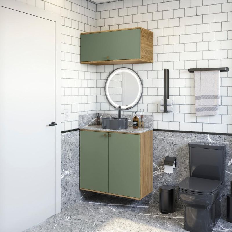 Para espaços menores e otimizados, aposte na beleza e qualidade do 100% MDF da Celeste da Kappesberg. A escolha ideal para quem possui um banheiro pequeno e não abre mão de estilo e praticidade, o combo CB1285 será o complemento ideal para ter na sua casa. Com dois módulos de aéreo, você terá o espaço necessário para armazenar toalhas, cestos e demais itens do seu dia a dia. Fácil de adaptar, com até sete camadas de pintura, a caixaria é na cor nogueira, com acabamento touch, enquanto as frentes são em verde oliva, com acabamento fosco. Uma combinação sofisticada e única, e remetendo aos tons da natureza, trará conforto e elegância, deixando seu banheiro completo. As portas contam com amortecimento, garantindo um fechamento suave, sem ruído e mais durabilidade, e para completar a beleza dos módulos, os puxadores, metálicos na cor dourada, transformam seu projeto com estilo. Aposte na Celeste e monte seu banheiro com toda a beleza e praticidade que a Kappesberg oferece.Informações Importantes:As imagens são meramente ilustrativas, não acompanha acessórios;Pode haver variação de cor de acordo com a calibragem da tela onde o produto está sendo visualizado;Tampo não incluso, é vendido separadamente;Todos nossos móveis são entregues desmontados;A montagem é sempre por conta do cliente (orientamos a contratação de um qualificado, o manual de montagem acompanha o produto);A altura do combo varia conforme a posição fixada na parede;O vídeo do produto pode ser genérico, então atente-se às imagens do anúncio para optar pela cor/modelo. Acabamento: Pintura Fosco / Pintura Touch | Cor: Nogueira/Verde Oliva | Dobradiça: Com Amortecimento / Sem Amortecimento | Garantia: 3 meses para defeito de fabricação | Matéria-prima: MDF | Peso suportado por cada prateleira: 7 kg | Puxadores: Metálicos | Quantidade de portas: 1 / 2 | Quantidade de prateleiras: 1 | Sistema de montagem: Parafuso Philips | Tipo de porta: Bater