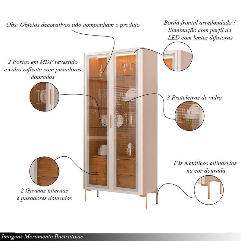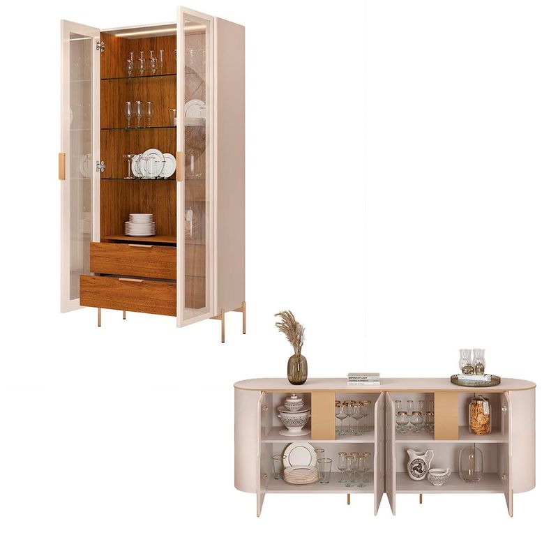Conjunto Cristaleira Vitória e Buffet América: Descubra a união perfeita de elegância e funcionalidade para sua casa. A Cristaleira Vitória, feita com MDP e MDF de alta qualidade, apresenta 2 gavetas internas com corrediça telescópica e puxadores dourados, além de 3 prateleiras de vidro iluminadas por LED com lentes difusoras. Suas 2 portas com vidro reflecta combinam praticidade e estilo, enquanto os pés metálicos cilíndricos dourados e o revestimento UV de 08 camadas garantem estabilidade e durabilidade excepcionais. Descubra também o Buffet América, essencial para sua sala de jantar, feito com MDP e MDF. Equipado com 4 portas com dobradiças amortecidas para fechamento suave, oferece internamente 2 prateleiras de MDF para organização eficiente. Os pés metálicos cilíndricos dourados conferem um toque sofisticado, e o revestimento interno e externo em impressão ultravioleta alto brilho e texturizada garante durabilidade e fácil manutenção. Este conjunto moderno e versátil é ideal para quem busca praticidade e estilo na decoração, transformando seu ambiente em um espaço organizado e convidativo. Dimensões do produto: