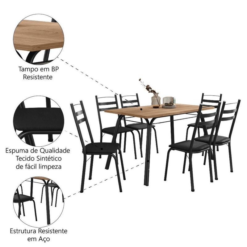 Conjunto De Mesa Sala De Jantar Com 6 Cadeiras Tubular Tampo Bp Madeirado Retangular 1,36m Preto
