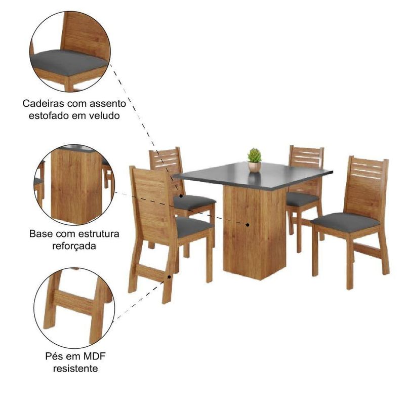 Conjunto De Mesa Sala De Jantar Lord Quadrada 0,90m 4 Cadeiras Veludo Viero Madeirado / Cinza