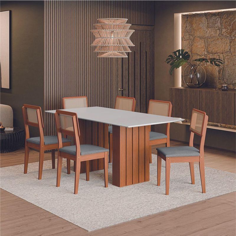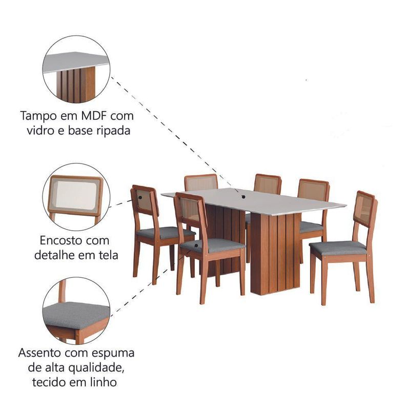 Conjunto De Mesa Sala De Jantar Ripada Tampo Com Vidro 1,80m 6 Cadeiras Santiago Dobuê Madeirado / Cinza