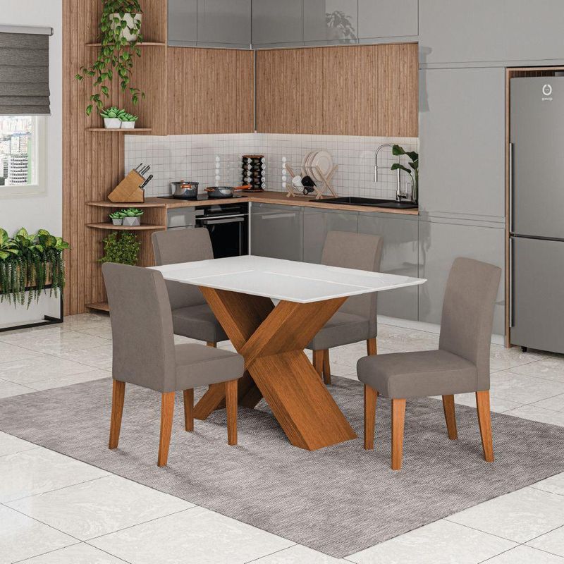 Conjunto De Mesa Sala De Jantar Tampo Com Vidro 1,36m Grécia 4 Cadeiras Trieste Dobuê Madeirado Mascavo