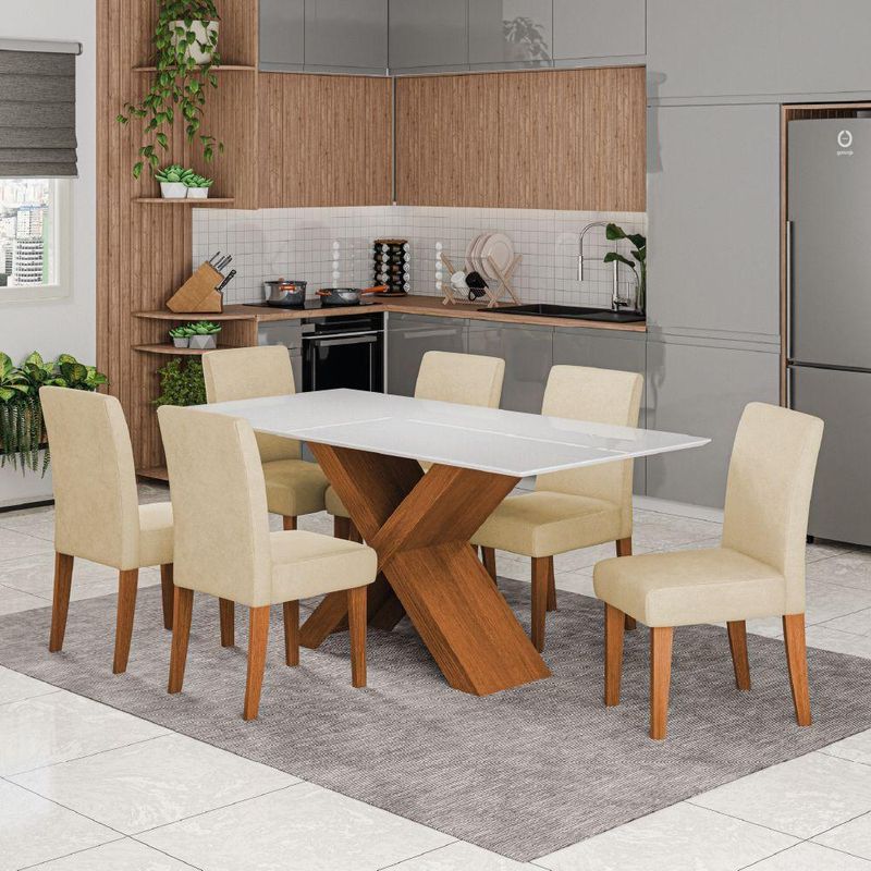 Conjunto De Mesa Sala De Jantar Tampo Com Vidro 1,80m Grécia 6 Cadeiras Trieste Dobuê Madeirado / Bege