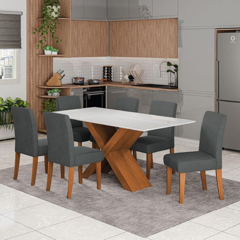 Conjunto De Mesa Sala De Jantar Tampo Com Vidro 1,80m Grécia 6 Cadeiras Trieste Dobuê Madeirado/grafite
