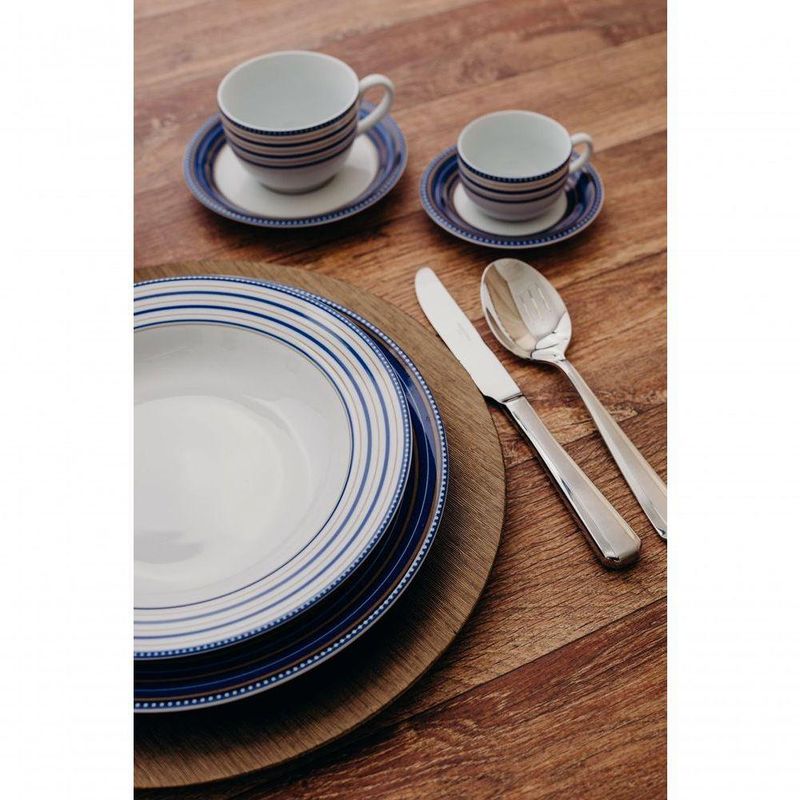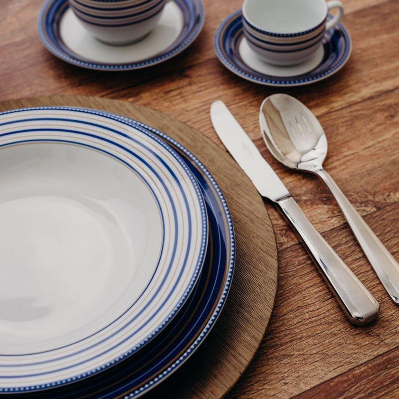 Conjunto de Pratos de Sobremesa 06 Peças Paula Schmidt A decoração Paula traz a tendência do azul marinho com a classe dos tons claros de marrom para a sua mesa, criando uma decoração única e bela. Essa composição é um clássico que combina com qualquer tableware, oferecendo a versatilidade de poder ser usada em comemorações que exigem mais requinte ou até mesmo em refeições simples! Conjunto de Pratos de Sobremesa 06 Peças Paula Schmidt - Incluso 6 Pratos Sobremesa - 19 cm Conjunto de Pratos de Sobremesa 06 Peças Paula Schmidt - Informações Uso: Resistente a micro-ondas, resistente a lava-louças Material: Porcelana Formato: Redondo Decoração: Linear Cor: Branco, azul marinho e marrom claro
