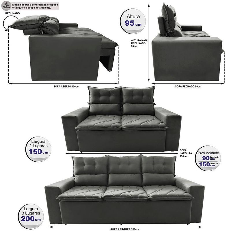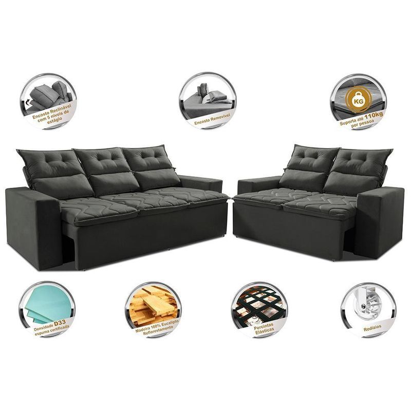 Conjunto De Sofá 3 E 2 Lugares Retrátil E Reclinável 2,00x1,50m Cama Inbox Smal Suede Cinza