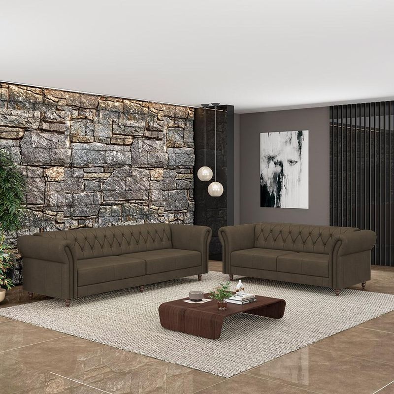 Transforme seu espaço com o Conjunto de Sofás Stanford Estilo Chesterfield, uma combinação que exala sofisticação e conforto em um design clássico e luxuoso. Ideal para criar um ambiente refinado e acolhedor, este conjunto é perfeito para quem valoriza a elegância e a qualidade superior em grande estilo.Cada sofá do conjunto é construído com madeira reflorestada de eucalipto, garantindo uma base robusta e sustentável que promove durabilidade e respeito ao meio ambiente.O encosto e os braços são preenchidos com fibra siliconada, proporcionando um toque macio e aconchegante. O assento é equipado com cinta elástica italiana tensionada e almofada ensacada de espuma D-26, oferecendo um suporte firme e confortável para uma experiência de uso superior.O revestimento em couro de alta qualidade traz um aspecto sofisticado e elegante, enquanto os pés torneados fixos em madeira maciça adicionam um charme refinado e garantem estabilidade e durabilidade.Com a robustez necessária para suportar até 240 kg por sofá, este conjunto é ideal para uso diário e proporciona uma experiência de sentar-se confortável e segura.O Conjunto de Sofás Stanford Estilo Chesterfield é a escolha perfeita para quem deseja um toque de classe e conforto em qualquer ambiente. Seu design atemporal e detalhes sofisticados fazem deste conjunto um destaque em qualquer sala de estar, escritório ou área de recepção.