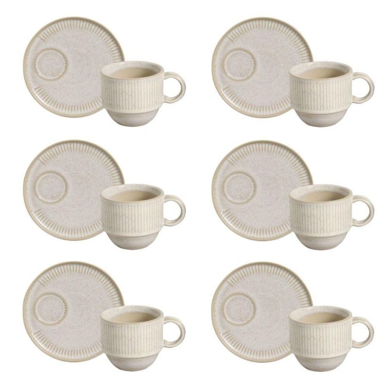 Conjunto de Xícara de Chá Empilhável com Pires 06 Peças Linhas Latte Porto BrasilO Stoneware, assim como a faiança feldspática e porcelana, é um material cerâmico. O Stoneware Porto Brasil é um material inovador e sustentável, onde a combinação das melhores matérias primas naturais, unido a um processo único de queima e acabamento manual, entregam um produto com características superiores em termos de qualidade e resistência, estando em conformidade com as principais normas mundiais. Além disso, conseguimos proporcionar peças exclusivas, onde alterações de formas, relevos e variações de cores são efeitos característicos dos produtos, evidenciando assim sua originalidade e autenticidade.Conjunto de Xícara de Chá Empilhável com Pires 06 Peças Linhas Latte Porto Brasil - Incluso6 Pires de Chá - 15,5 cm6 Xícaras de Chá - 230 mlConjunto de Xícara de Chá Empilhável com Pires 06 Peças Linhas Latte Porto Brasil - InformaçõesUso: Resistente a micro-ondas, resistente a lava-louçasMaterial: Cerâmica stonewareFormato: RedondoDecoração: Linhas LatteCor: Off-white (tons de bege bem claro)