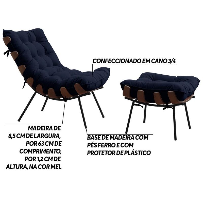 Altura da Base: 28 cm; Características do Produto: Material da Estrutura: Cano ¾ e Madeira; Base: Pés Palito Fixo; Revestimento: Veludo; Conteúdo da Embalagem: 1 Poltrona e 1 Puff; Necessita de Montagem: Sim; Instruções/Cuidado: Indicado para uso residencial/comercial, sua limpeza deve ser feita com pano úmido com água limpa, sem esfregar. Pode passar álcool líquido de uso doméstico na limpeza. Nunca sentar no encosto ou braços do produto.