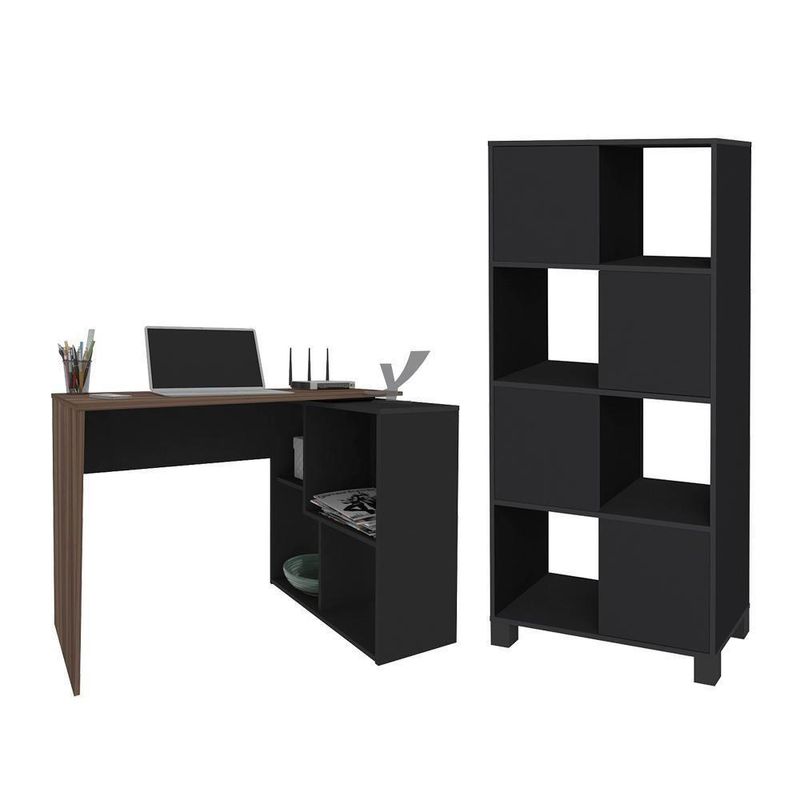 formato linear ou em “L”.Prateleira: Sim, (2)Nichi: Sim, (4)Pés: Sim, Sapatas plásticasLateral e tampo com corte diagonalMaterial: MDPCor: Ipê/PretoMedidas do Armário:Altura: 145 cmLargura: 67,5 cmComprimento: 36 cmInformações do Balcão:Portas: NãoPés: Sim, (4)Material: MDPCor: PretoItens Inclusos:1- Escrivaninha