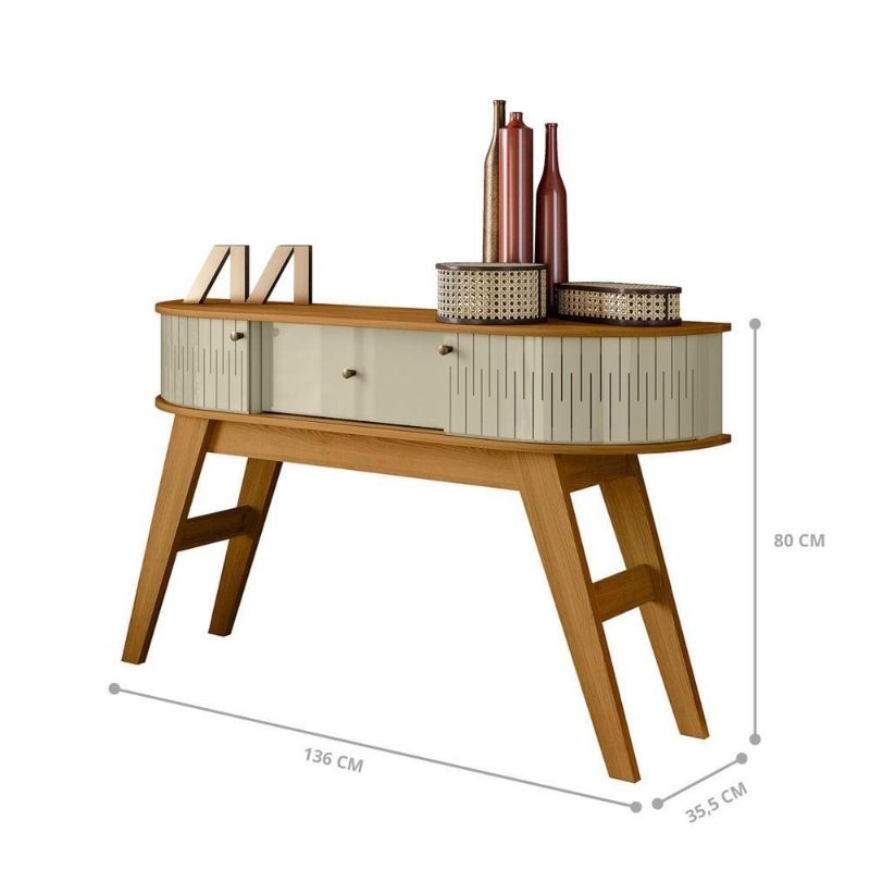Dimensões do Aparador:Altura: 80cmLargura: 136cmProfundidade: 35,5cmMaterial Principal: MDPInformações Complementares:Cor: Cumaru/OpalaPortas: Sim (2)Suporta até 25 kg.