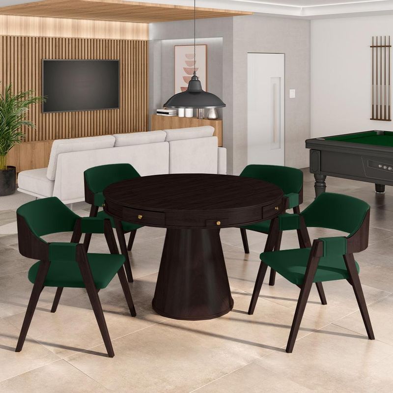 em Tecido Verde/ Madeira Lisa Tabaco da cor da mesa;
