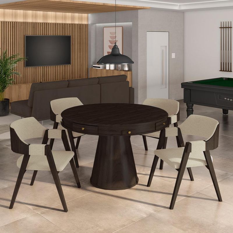 Complementando a mesa, as 4 Cadeiras de Poker em Madeira Maciça são o exemplo perfeito de artesanato e conforto. Cada cadeira é esculpida em madeira maciça, oferecendo uma solidez que combina perfeitamente com o design clássico. Os estofamentos luxuosos proporcionam um assento agradável, permitindo horas de jogo sem comprometer o conforto.