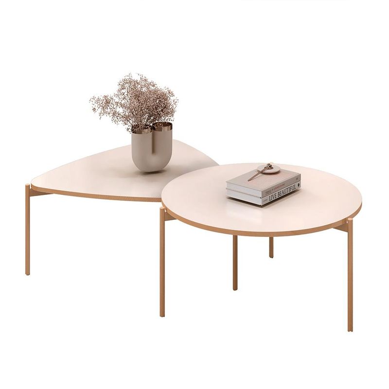 Descubra a sofisticação e a versatilidade do conjunto de mesas de centro Oak e Dutton, ideal para quem busca unir elegância e funcionalidade na decoração. A Mesa de Centro Oak é confeccionada em MDF de alta qualidade, com um tampo usinado em formato triangular e cantos arredondados, conferindo um design único e moderno. Seus pés metálicos cilíndricos na cor dourada adicionam um toque de requinte, enquanto o revestimento interno e externo com impressão ultravioleta alto brilho e texturizada proporciona um acabamento refinado e durável. Complementando o conjunto, a Mesa de Centro Dutton também é fabricada em MDF de alta qualidade, com um tampo usinado em formato circular que oferece uma estética contemporânea e elegante. Seus pés metálicos cilíndricos na cor dourada harmonizam perfeitamente com o design da mesa Oak, criando uma unidade visual coesa e sofisticada. O revestimento interno e externo da Dutton, igualmente realizado com impressão ultravioleta alto brilho e texturizada, garante um visual impecável e resistente ao desgaste. Este conjunto de mesas de centro é a escolha perfeita para diversos estilos de decoração, desde ambientes mais clássicos até os mais modernos. As mesas Oak e Dutton não apenas elevam a estética do espaço, mas também oferecem funcionalidade e praticidade, sendo ideais para salas de estar, escritórios ou qualquer outro ambiente que necessite de um toque de elegância. Adquira já o conjunto de mesas de centro Oak e Dutton e transforme seu espaço com peças que combinam design sofisticado, durabilidade e utilidade! Dimensões do produto:
