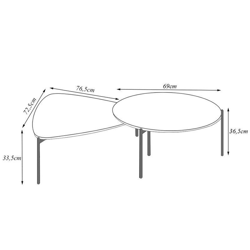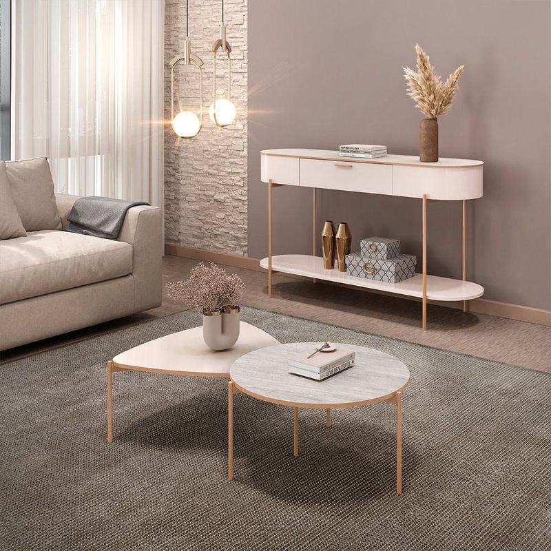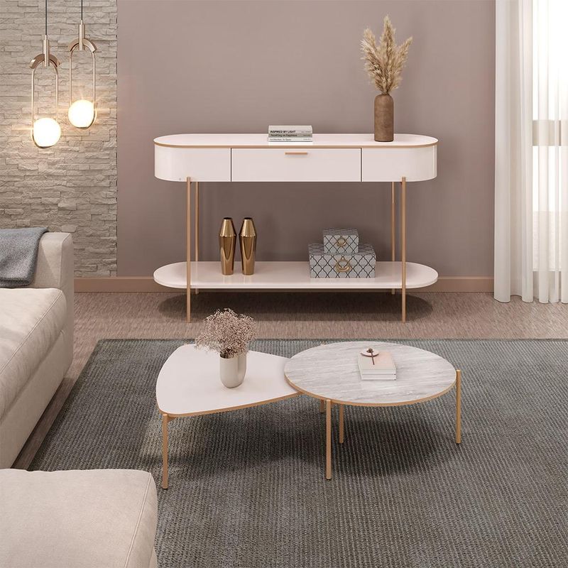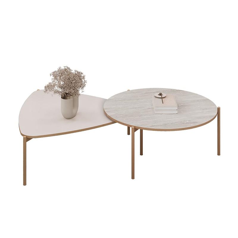 Descubra a sofisticação e a versatilidade do conjunto de mesas de centro Oak e Dutton, ideal para quem busca unir elegância e funcionalidade na decoração. A Mesa de Centro Oak é confeccionada em MDF de alta qualidade, com um tampo usinado em formato triangular e cantos arredondados, conferindo um design único e moderno. Seus pés metálicos cilíndricos na cor dourada adicionam um toque de requinte, enquanto o revestimento interno e externo com impressão ultravioleta alto brilho e texturizada proporciona um acabamento refinado e durável. Complementando o conjunto, a Mesa de Centro Dutton também é fabricada em MDF de alta qualidade, com um tampo usinado em formato circular que oferece uma estética contemporânea e elegante. Seus pés metálicos cilíndricos na cor dourada harmonizam perfeitamente com o design da mesa Oak, criando uma unidade visual coesa e sofisticada. O revestimento interno e externo da Dutton, igualmente realizado com impressão ultravioleta alto brilho e texturizada, garante um visual impecável e resistente ao desgaste. Este conjunto de mesas de centro é a escolha perfeita para diversos estilos de decoração, desde ambientes mais clássicos até os mais modernos. As mesas Oak e Dutton não apenas elevam a estética do espaço, mas também oferecem funcionalidade e praticidade, sendo ideais para salas de estar, escritórios ou qualquer outro ambiente que necessite de um toque de elegância. Adquira já o conjunto de mesas de centro Oak e Dutton e transforme seu espaço com peças que combinam design sofisticado, durabilidade e utilidade! Dimensões do produto: