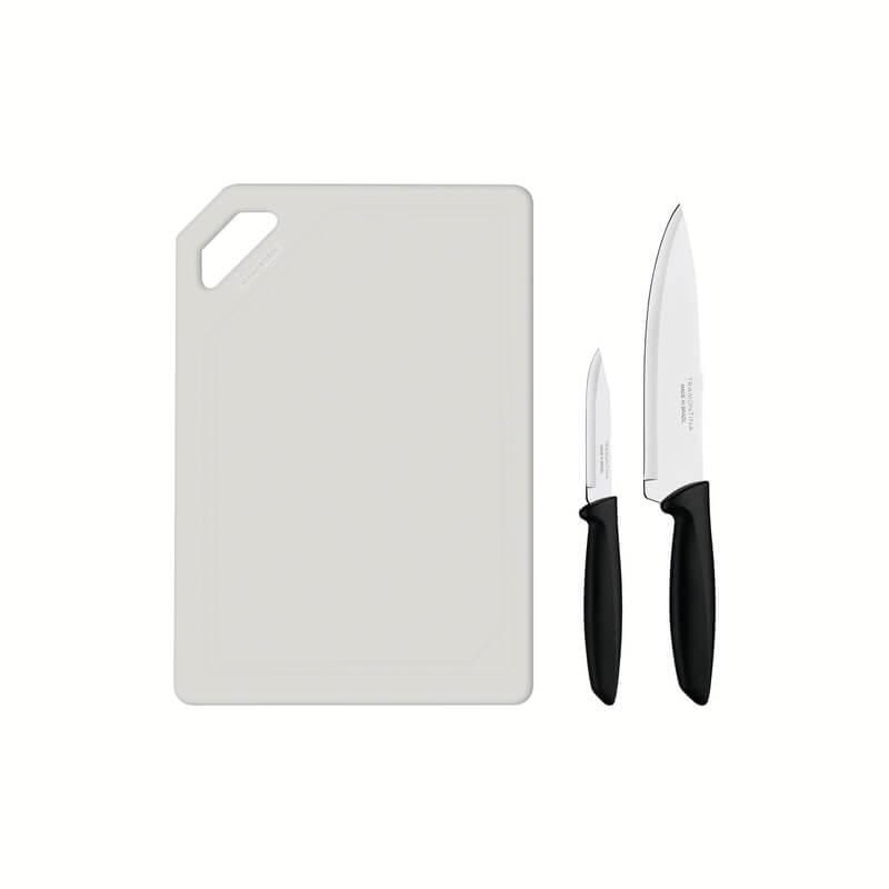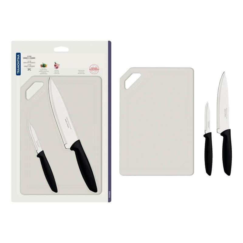 O kit para carnes e legumes Tramontina Plenus com lâminas em aço inox cabos de polipropileno preto e tábua para cortar 3 peças é essencial para qualquer cozinha. O kit de três peças atende diferentes usos e necessidades: do preparo dos alimentos ao serviço de mesa. Ideal para cortar carnes e legumes, acompanha tábua de corte em polipropileno na cor branca. O cabo das facas é de polipropileno na cor preta, confortável no manuseio. As lâminas em aço inox são resistente. São peças que se adequam a diferentes momentos, do café da manhã ao jantar com os amigos. Fáceis de limpar, podem ser levadas à máquina de lavar louças.