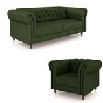 MóveisSofásConjunto Sala de Estar 1 Sofá Living 180cm e 1 Poltrona Stanford Chesterfield Pés Madeira Couro Verde Manchado G58 - Gran Belo