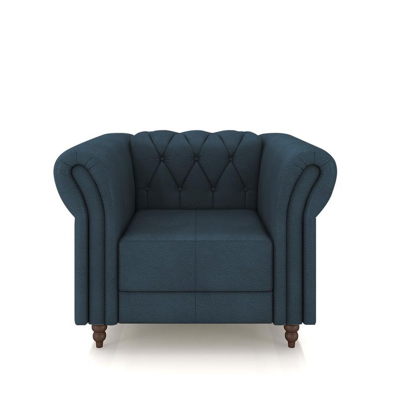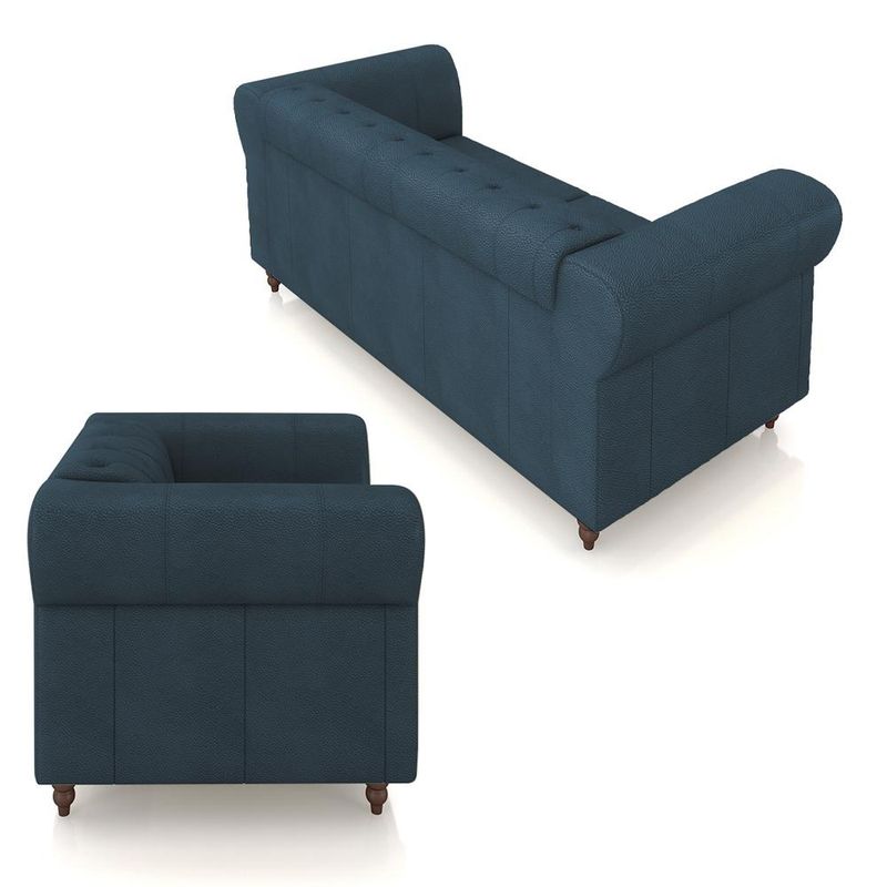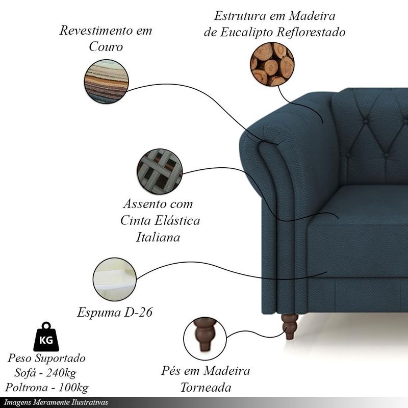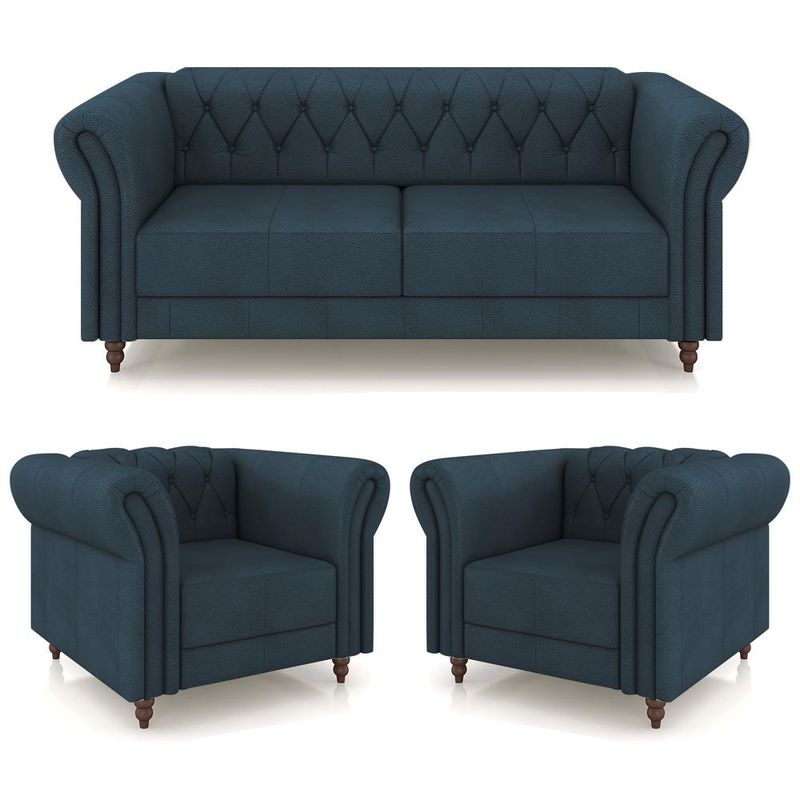 MóveisSofásConjunto Sala de Estar 1 Sofá Living 180cm e 2 Poltronas Stanford Chesterfield Pés Madeira Couro Azul Marinho G58 - Gran Belo