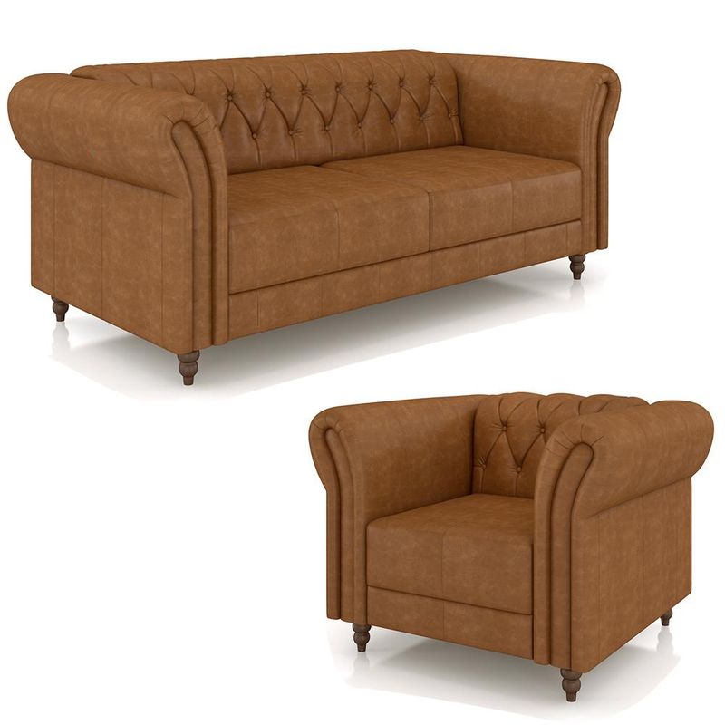 Transforme seu espaço com o Sofá e a Poltrona Stanford Chesterfield, um verdadeiro símbolo de sofisticação e conforto. Ambos os móveis são projetados com uma estrutura robusta de madeira reflorestada de eucalipto, garantindo durabilidade e um compromisso com a sustentabilidade ambiental. O encosto e os braços são preenchidos com fibra siliconada, proporcionando uma experiência de sentar-se macia e aconchegante, ao mesmo tempo que mantém a forma e o suporte.O assento é um destaque à parte, com cinta elástica italiana tensionada e uma almofada ensacada de espuma D-26, oferecendo uma sensação de conforto firme e bem estruturado. Esta combinação promove um suporte excepcional e durabilidade, ideal para o uso diário.Os pés torneados fixos são confeccionados em madeira maciça, adicionando um toque de elegância clássica e estabilidade ao conjunto. O revestimento em couro não só confere um visual luxuoso e atemporal, mas também é fácil de manter e resiste ao desgaste, garantindo que seu sofá e poltrona mantenham sua beleza por muitos anos.O Sofá e a Poltrona Stanford Chesterfield são perfeitos para quem busca um equilíbrio entre estilo sofisticado e conforto inigualável. Seja para uma sala de estar, escritório ou espaço de recepção, estes móveis agregam um toque de classe e são a escolha ideal para criar um ambiente acolhedor e refinado.
