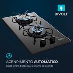 ACENDIMENTO AUTOMÁTICO: Agilidade e segurança para o dia a dia. Basta girar o botão que a chama acende.