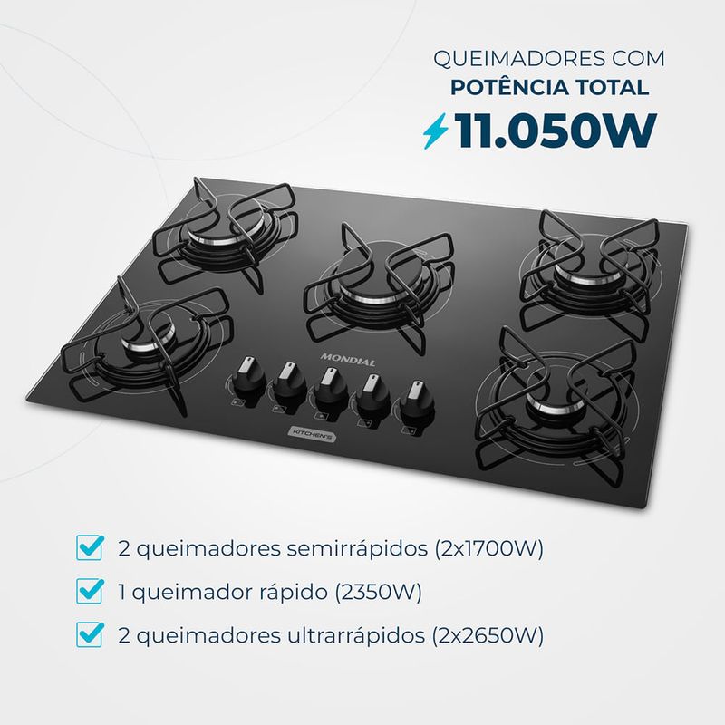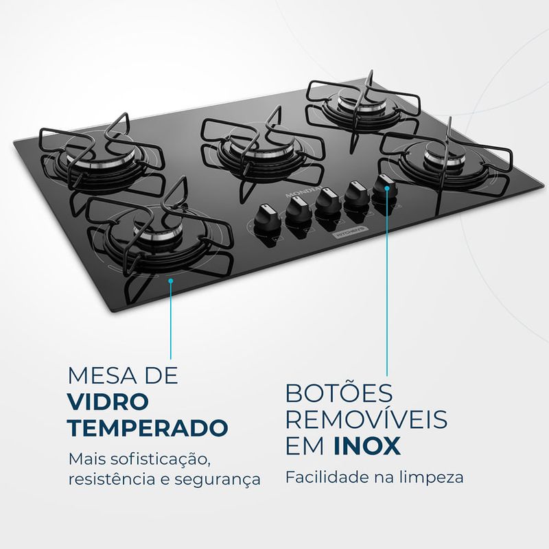 O Cooktop a Gás 5 Bocas CTG-02 une qualidade e potência a um design moderno que vai trazer sofisticação para sua cozinha. Possui mesa com melhor disposição e aproveitamento entre as bocas, 5 queimadores com potência total de 11.050W e mesa de vidro temperado. Os botões têm acabamento em aço inox e são removíveis, permitindo uma limpeza eficaz e evitando o acúmulo de gordura. Saiba mais sobre o CTG-02 da Mondial: