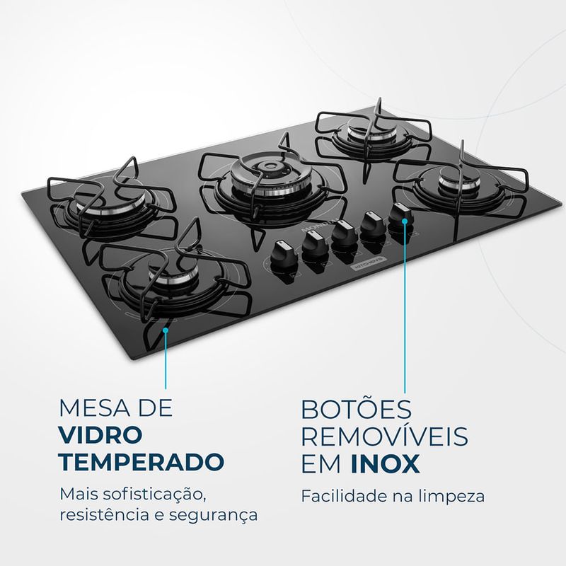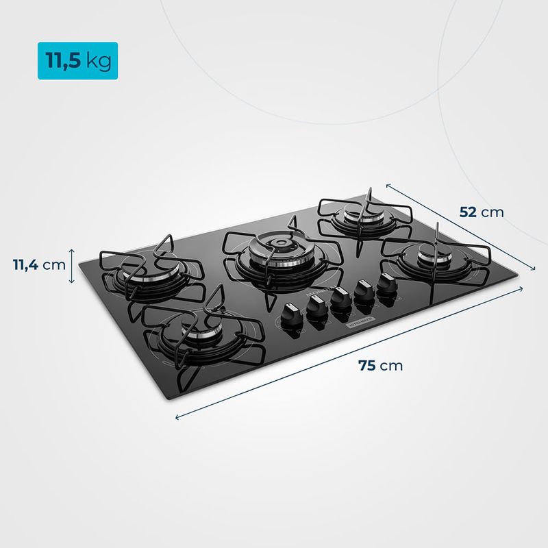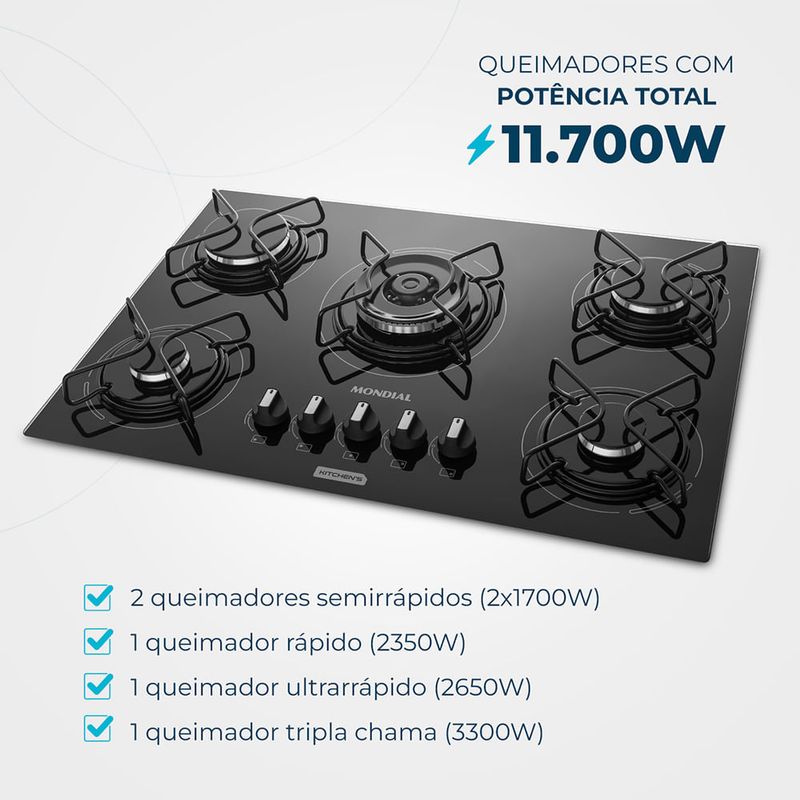 O Cooktop a Gás 5 Bocas Tripla Chama CTG-03 garante mais potência e rapidez no preparo dos alimentos. Possui mesa de vidro temperado, com melhor disposição e aproveitamento entre as bocas e 5 queimadores com potência total de 11.050W, sendo 1 queimador Tripla Chama. Os botões são removíveis, têm detalhamento em aço inox, e o acendimento das chamas é automático. Saiba mais sobre o CTG-03 da Mondial: