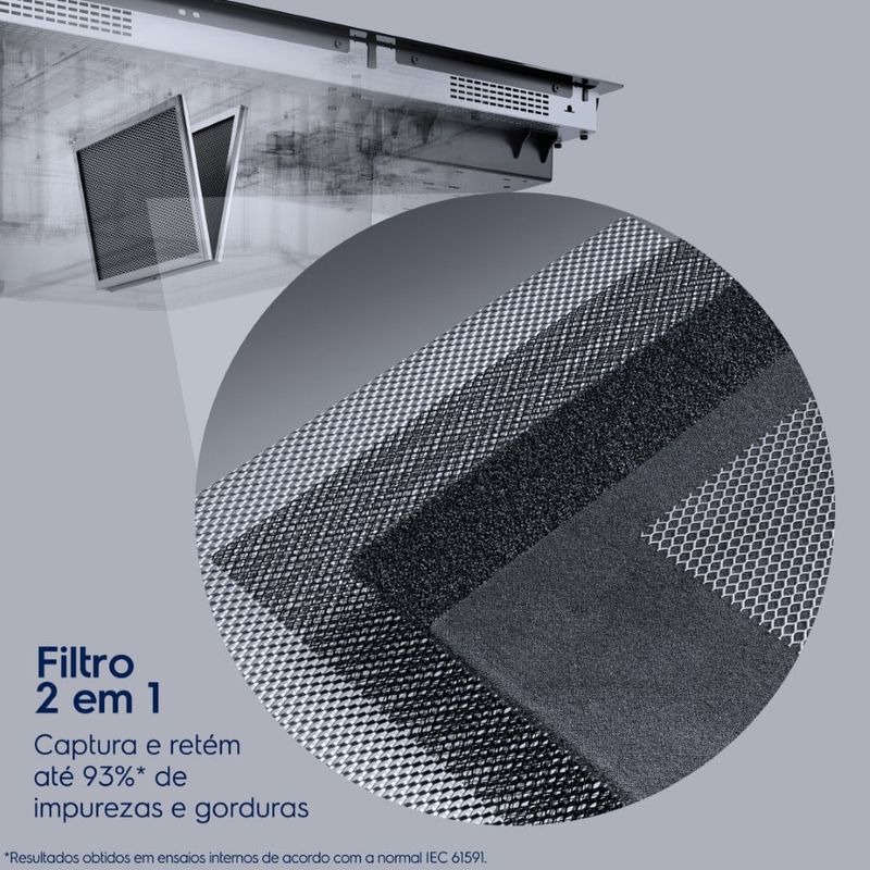 O Cooktop conta com filtro dois em um de alumínio, que retém mais de 93%7 de gorduras e impurezas e o filtro de carvão ativado, que pode ser lavado em lava-louças e com durabilidade de até 2 anos8. Ou seja, uma cozinha livre de odores indesejáveis. Um ponto crítico num projeto que agora pode ser facilmente resolvido.