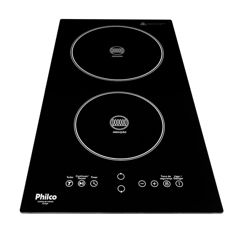 O Cooktop de Indução Philco PCT02P 2 Bocas Turbo tem 9 níveis de potência e Funções Turbo, Pausa, Trava de painel e Timer.