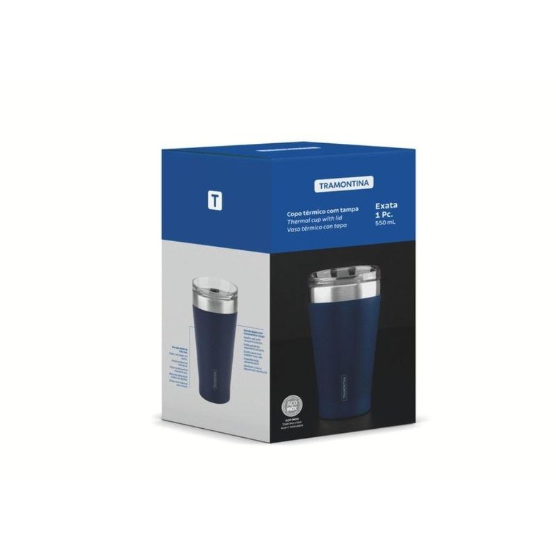 Copo Térmico Exata em Aço Inox Azul com Tampa 550 ml TramontinaSua rotina fica muito mais prática, com o copo térmico Tramontina Exata em aço inox com parede dupla azul com tampa 550 ml. Ideal para levar seu café, chá ou vitamina para os compromissos, ele é produzido em aço inox com parede dupla e isolamento a vácuo, que mantém suas bebidas na temperatura ideal por muito mais tempo. Ele é livre de BPA, não mancha e não retém odores, além de vir acompanhado de tampa com abertura e acabamento de silicone que facilita a vedação. Escolha sua bebida preferida e aproveite seu dia a dia na companhia da Tramontina!Copo Térmico Exata em Aço Inox Azul com Tampa 550 ml Tramontina - Especificações TécnicasOs copos Térmicos inox Tramontina são feitos em parede dupla de aço inox com isolamento a vácuo para manter as bebidas frias ou quentes por mais tempo.