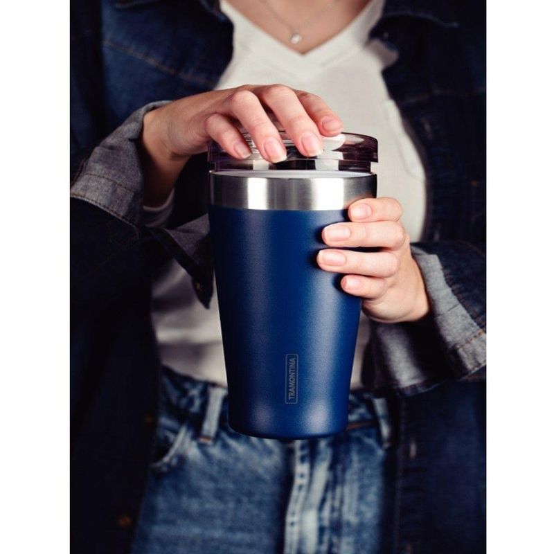 A tampa evita respingos ou que o usuário derrame o líquido demasiadamente.Copo Térmico Exata em Aço Inox Azul com Tampa 550 ml Tramontina - Na sua casa!