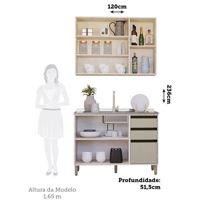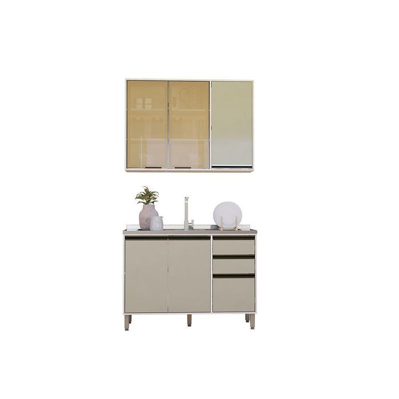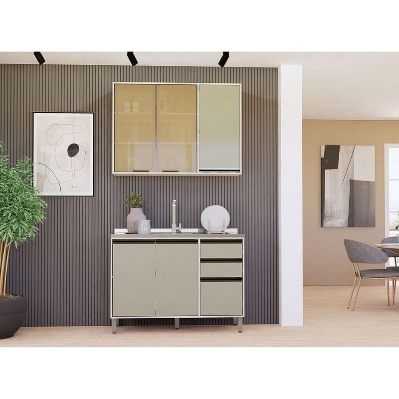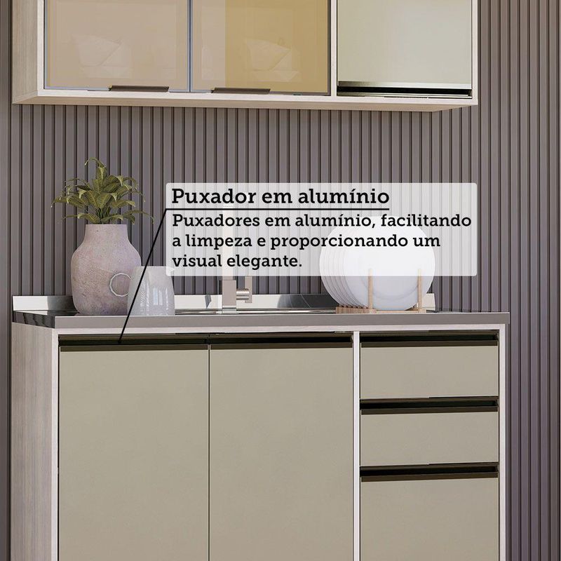 A Cozinha Linea foi desenvolvido aliando beleza e praticidade ao seu ambiente. As portas embutidas remetem ao planejado, ainda conta com acessorios requintados como dobradicas em 35mm com amortecimento Slowmotion, dobradica com amortecedor incorporado para fechamento suave de portas, puxadores tipo gola em perfil aluminio na Inox e pes em PS (poliestireno) na champagne. Possui gavetas com corredicas metalicas telescopicas em tres estagios, para abertura total. Perfeito para sua cozinha.