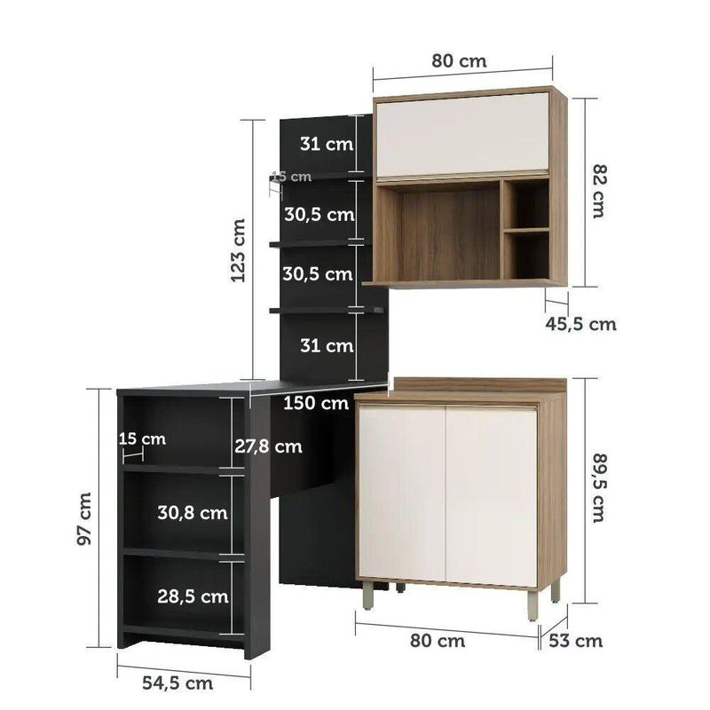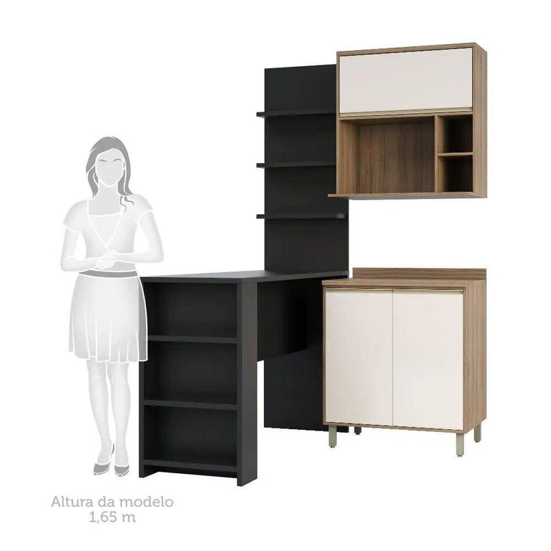 Cozinha Compacta 4 Peças Com Bancada Mesa Gourmet Armário Com Nicho Balcão 80cm Mel Luciane Móveis Vanilla Com Pérola Off