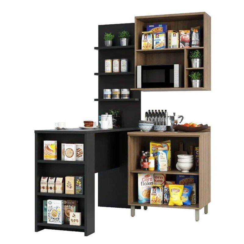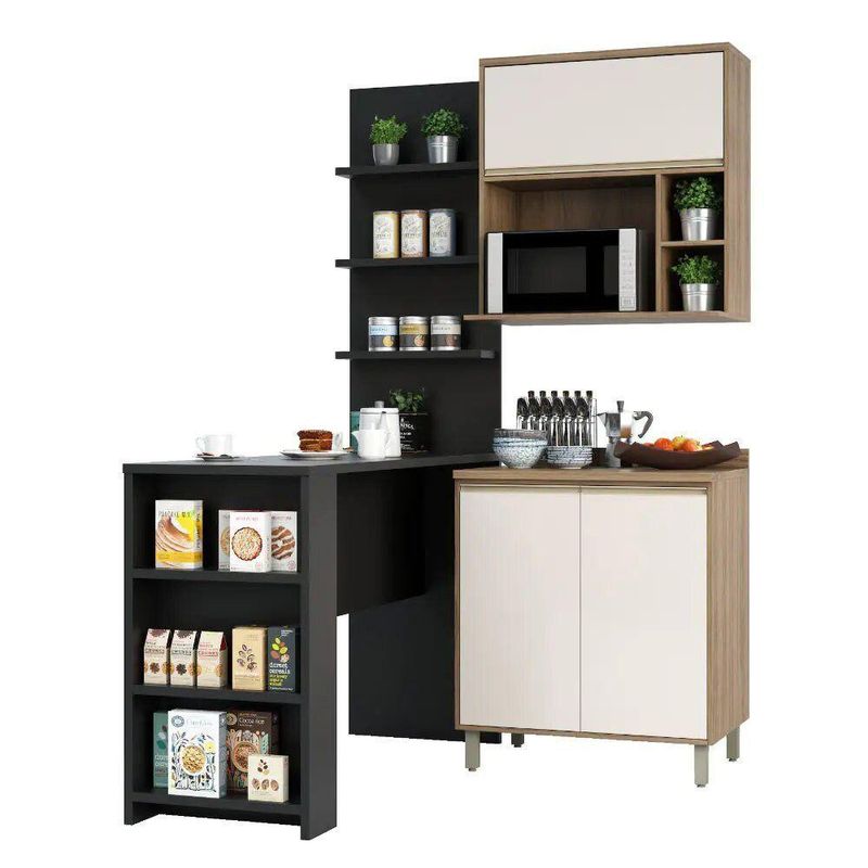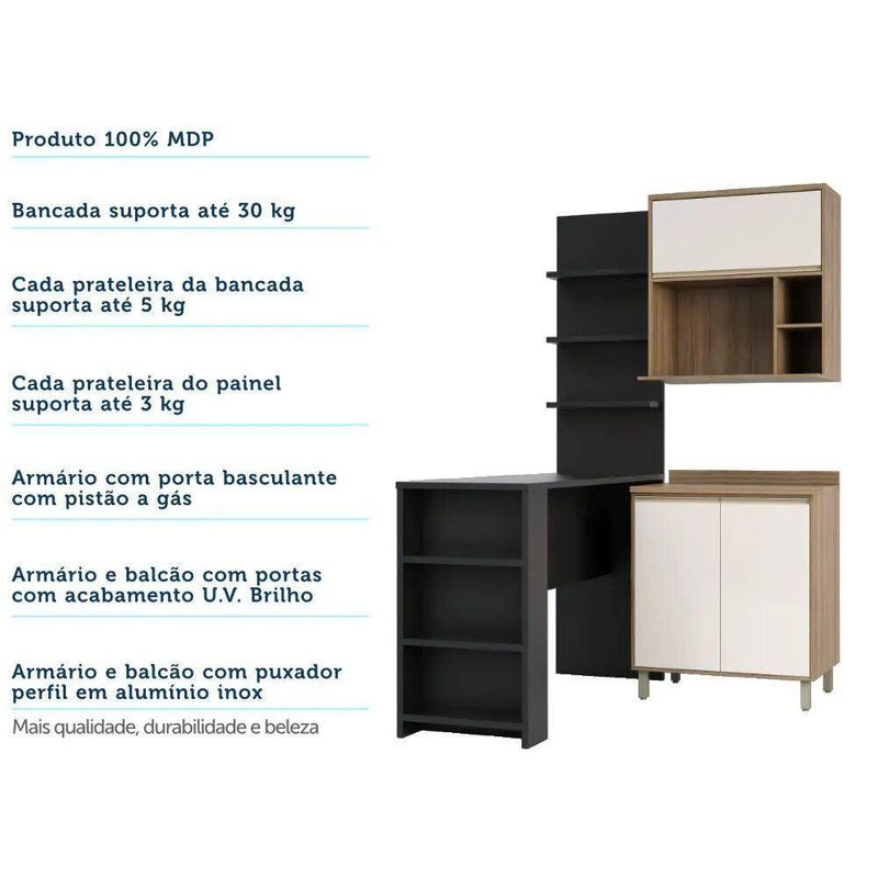 Cozinha compacta com 4 módulos pensados para compor seu ambiente aproveitando o melhor do espaço disponível. A Bancada Mesa Gourmet pode ser utilizada como divisor de ambientes, mesa para refeições e espaço para momentos de lazer e descontração. A Cozinha fica completa com o painel 3 prateleiras, Armário aéreo 80cm 1 porta basculante e nicho micro-ondas conjugado e Balcão 80cm 2 portas com tampo, para manter tudo bem organizado. Os módulos são montados individualmente e permite a instalação da forma que melhor se adeque ao seu espaço.