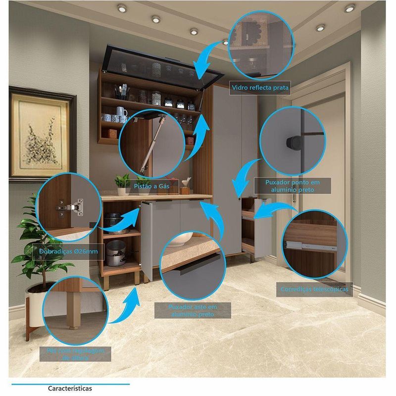 - 1 Armario Aereo de Cozinha 120cm 1 Porta Basculante com Vidro Reflecta e Nichos Aspen Luciane Moveis
