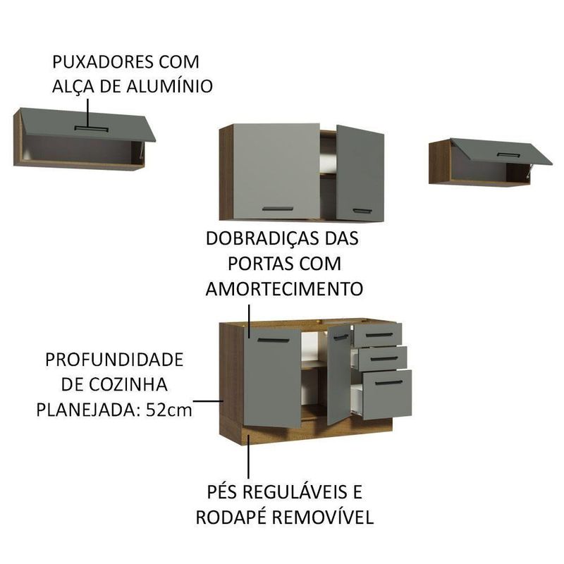 Cozinha Compacta Agata com Armário e Balcão Rustic/cinza MadesaTodas as portas contam com puxador com alça de alumínio e dobradiças que amortecem o fechamento e as gavetas possuem corrediça telescópica.